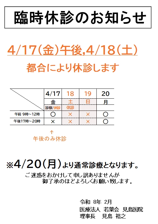 > 令和8年4/17(金)午後 、4/18(土) 臨時休診のお知らせ